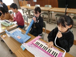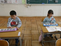 1年生は、音楽科の授業で、けん盤ハーモニカで「すずめがチュン」を演奏しました。いろいろな動物の鳴き声の部分を、その動物の鳴き声の特徴に合わせて、工夫しながら弾きました。タンギングも上手にできていました。