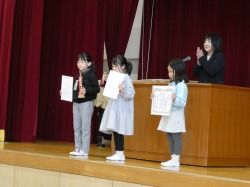 初めに表彰を行いました。次に、先生からのお話がありました。箱根駅伝の「たすき」についてのお話でした。「つなぐ」ことの大切さを教えてもらいました。続いて、総務委員から今月の目標の「廊下の歩き方」について、児童会長から「健康に過ごすため」についてのお話がありました。最後に健康委員会から、「さわやかしらべ」のお知らせがありました。児童たちは、立派な態度で朝会に臨むことができました。