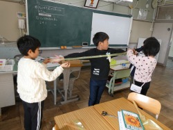 2年生は、算数科の授業で、両手を広げた長さを友達と協力しながら測りました。