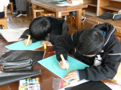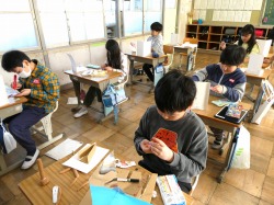 4年生は、図画工作科の授業で、版画に取り組みました。板に自分の顔を描き、彫刻刀で彫る部分、彫らない部分をマジックで色を塗って分かるようにしていました。