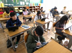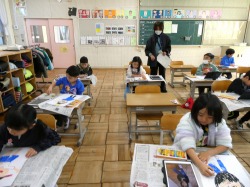 5年生は、社会科の授業で、2つの新聞を比較して、記事の内容の違いを見つけていました。