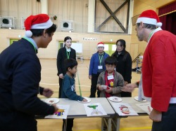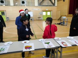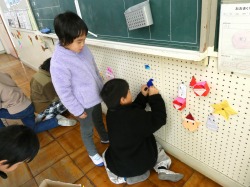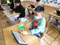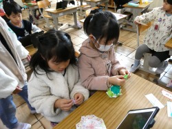 1年生は、生活科の授業で、折り紙でクリスマスの飾りを作りました。タブレット端末で、折り方を見ながら作りました。トナカイ、リース、クリスマスツリーなど、素敵な飾りができました。出来上がった作品は、教室の後ろに掲示しました。