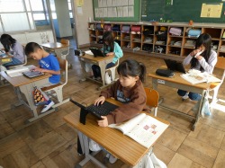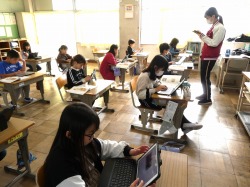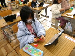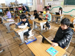 2年生は、国語科の授業で、自分たちが作ったお話を友達同士で読み合い、感想をタブレット端末に入力していました。「おもしろい!」という声が上がっていました。