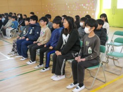 最初に担任の先生から、文字職人の杉浦誠司さんのお話がありました。素敵な言葉を紹介していただきました。興味のある方は、ぜひ調べてみてください。次に、総務委員から「整理整頓」について、児童会長から「卒業式・修了式に向けての心構え」についてのお話がありました。最後に今月の歌を歌いました。