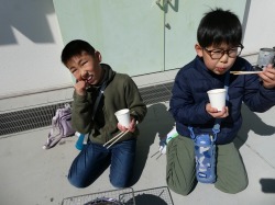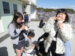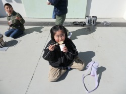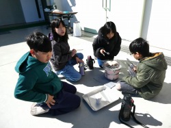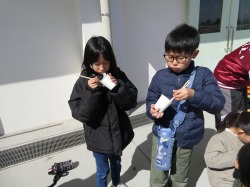 七輪でお餅を焼く体験をしました。「外でお餅を焼くのは初めて!」「お餅が膨らんだ!」「外はカリカリで中はもっちりでおいしい!」という声が上がっていました。よい体験ができましたね。