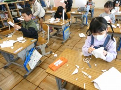 1年生は、図画工作科の授業で、「おってたてたら」を学習しました。画用紙をいろいろな折り方をして立たせ、見えた形に合わせて色を塗ります。はさみできったり、折り方を工夫したりして、個性的な作品をつくっていました。
