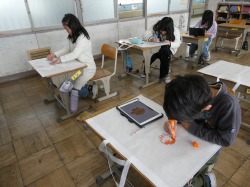 1年生は、今まで学習してきたプリントを綴じたときに表紙にするデザインを考えました。ICT支援員の先生と担任の先生にタブレット端末の操作の仕方を教えてもらいながら、個性的な表紙を作成していました。