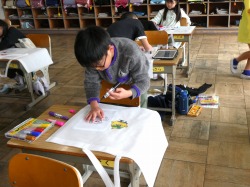 3年生は、作品バッグに絵を描いていました。自分の好きなキャラクターや動物などを楽しそうに描いていました。