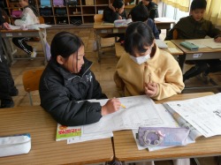 4年生は、算数科の授業で、復習問題を解いていました。分からないところは、友達同士で教え合っていました。