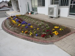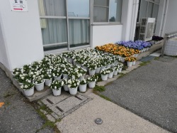 1~5年生が一人二鉢で植えたパンジーの苗がずいぶん大きくなり、花がもうすぐ満開です。また、用務員さんと校務主任の先生が植えてくださった花壇も色とりどりの花を咲かせています。お花も卒業式に向けて準備万端です。