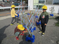 1年生は、生活科の授業で育てているあさがおの種をとったり、つるなどの様子を観察したりしました。