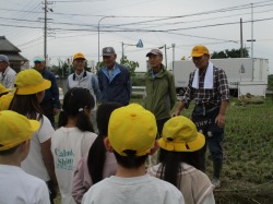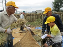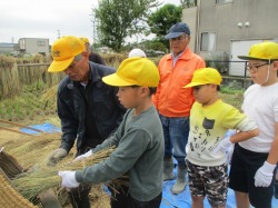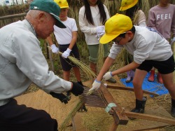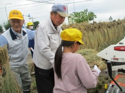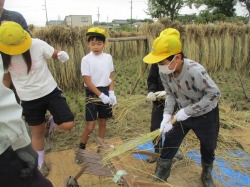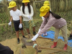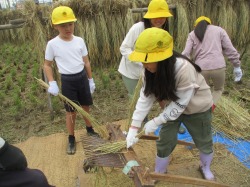 2・3時間目に脱穀を体験しました。千歯こぎ機(江戸時代から明治時代)、足踏み式脱穀機(大正時代から昭和中期)、自走式自動脱穀機(昭和中期から50年代まで)の3種類の脱穀機で脱穀をさせていただきました。現代では、刈り取り、脱穀、選別まで全部機械で行うことができるそうです。昔の人たちの苦労がよく分かりました。ちなみに、子どもたちには、足踏み式脱穀機が人気でした。