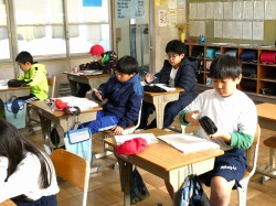 4年生は、社会科の授業で、「知多半島の治水」について学習しました。先生が黒板に書いた字を、丁寧にノートに写していました。