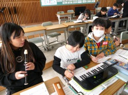 2年生は、音楽家の授業で、合奏と歌に取り組みました。笑顔で元気いっぱいに歌ったり、演奏したりしていました。