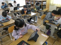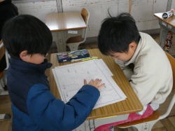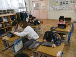 4年生は、算数科の授業で、復習問題を解いていました。分からないところは、友達同士で教え合っていました。