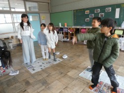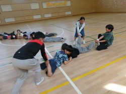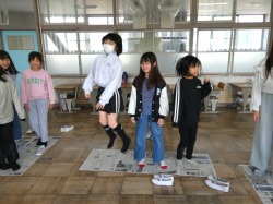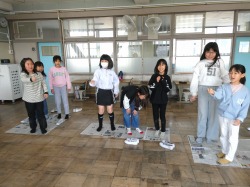 3年生は、お楽しみ会を行いました。グループごとに新聞紙に乗り、じゃんけんで負けたグループが新聞紙を半分に折っていくゲームをしていました。
