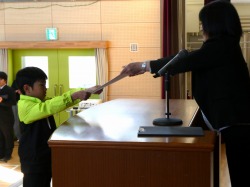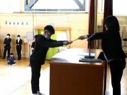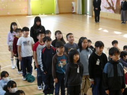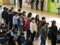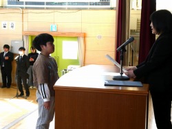 はじめに、校長先生から各学年の代表児童が修了証を受け取りました。校長先生からは、「一年間のまとめ」についてのお話がありました。最後に校歌を歌いました。修了式が終わった後は、生活指導の先生から、春休みの過ごし方についてのお話がありました。「は」やねはやおきあさごはん、「る」ーるをまもろう、「や」りましょうふくしゅう「す」すすんでおてつだい、「み」んなげんきなかおで4がつにあいましょう!