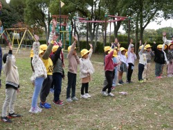 1年生は、「あきをたのしもう」です。どんぐりやいちょうなどの見つけた秋について発表したり、鍵盤ハーモニカで「どんぐりぐりぐり」を演奏したりしました。また、松ぼっくりやどんぐりを使って作ったおもちゃで、お客さんに遊んでもらいました。葉っぱの帽子も素敵です!