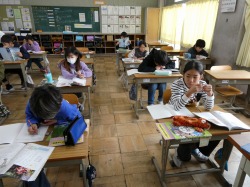 4年生は、社会科の授業で、木曽三川の治水工事について学習しました。教科書の文章を読んで、気付いたことを集中してノートに書きました。