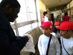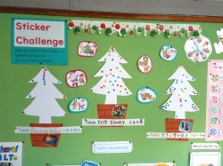 外国語担当の先生が、「ステッカーチャレンジ」を企画しました。ALTの先生に話しかけて、コミュニケーションがとれたら、ステーカーをもらい、ツリーに貼ります。1・6年、2・5年、3・4年のペアのクリスマスツリーの中で、どのチームにたくさんの飾りがつくか楽しみです。英語に触れるよい機会なので、どんどんALTの先生に話しかけましょう。