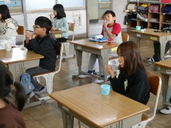 今週は、歯みがきチェック週間なので、健康委員が歯みがきの順序の説明をするために、各教室へ行っています。1年生の様子です。健康委員の説明に従って、真剣に歯みがきをしていました。健康委員のみなさん、ありがとうございます。