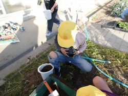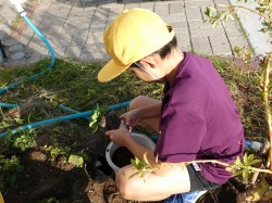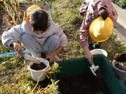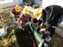 6年生に感謝の気持ちを伝えるために、1~5年生の児童は、卒業式で飾るパンジーの苗を一人二鉢植えています。今日は、3年生が心を込めて植えました。卒業式には、きれいな花が咲くと思います。