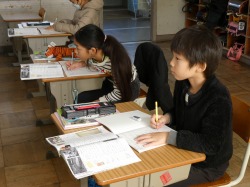 4年生は、社会科の授業で、「知多半島の治水」について学習しました。先生が黒板に書いた字を、丁寧にノートに写していました。