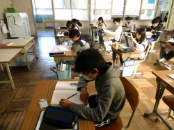 5年生は、算数の授業で、「単位量あたりの大きさ」を学習しました。計算ドリルに真剣に取り組んでいました。