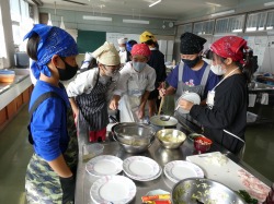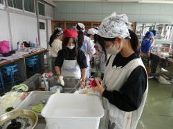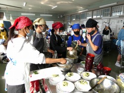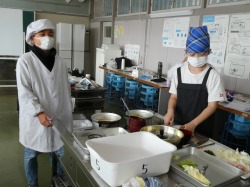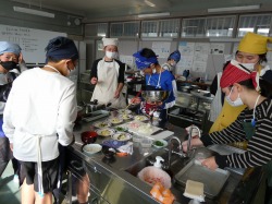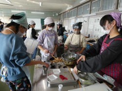 6年生は、家庭科の授業で、調理実習を行いました。グループで決めた、「厚揚げと野菜のチャンプルー」「すまし汁」「野菜スープ」などを作りました。一階までよい香りが漂ってきました。