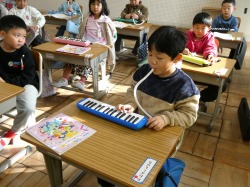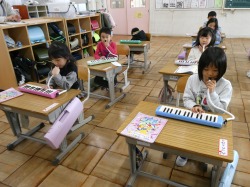 1年生は、音楽科の授業で、けん盤ハーモニカで「すずめがチュン」を演奏しました。いろいろな動物の鳴き声の部分を、その動物の鳴き声の特徴に合わせて、工夫しながら弾きました。タンギングも上手にできていました。