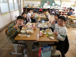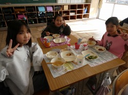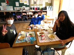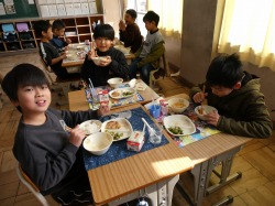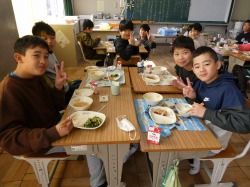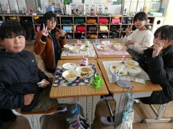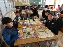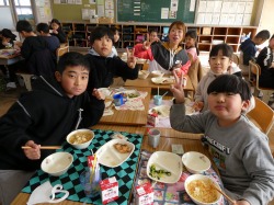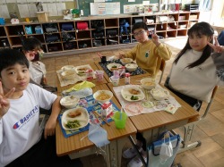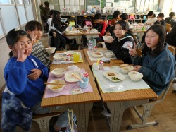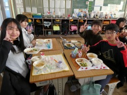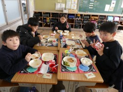 今日の給食の献立は、中華麺、牛乳、味噌ラーメンスープ、しゅうまい、切り干し大根の和え物でした。とてもおいしかったです。いつもありがとうございます。